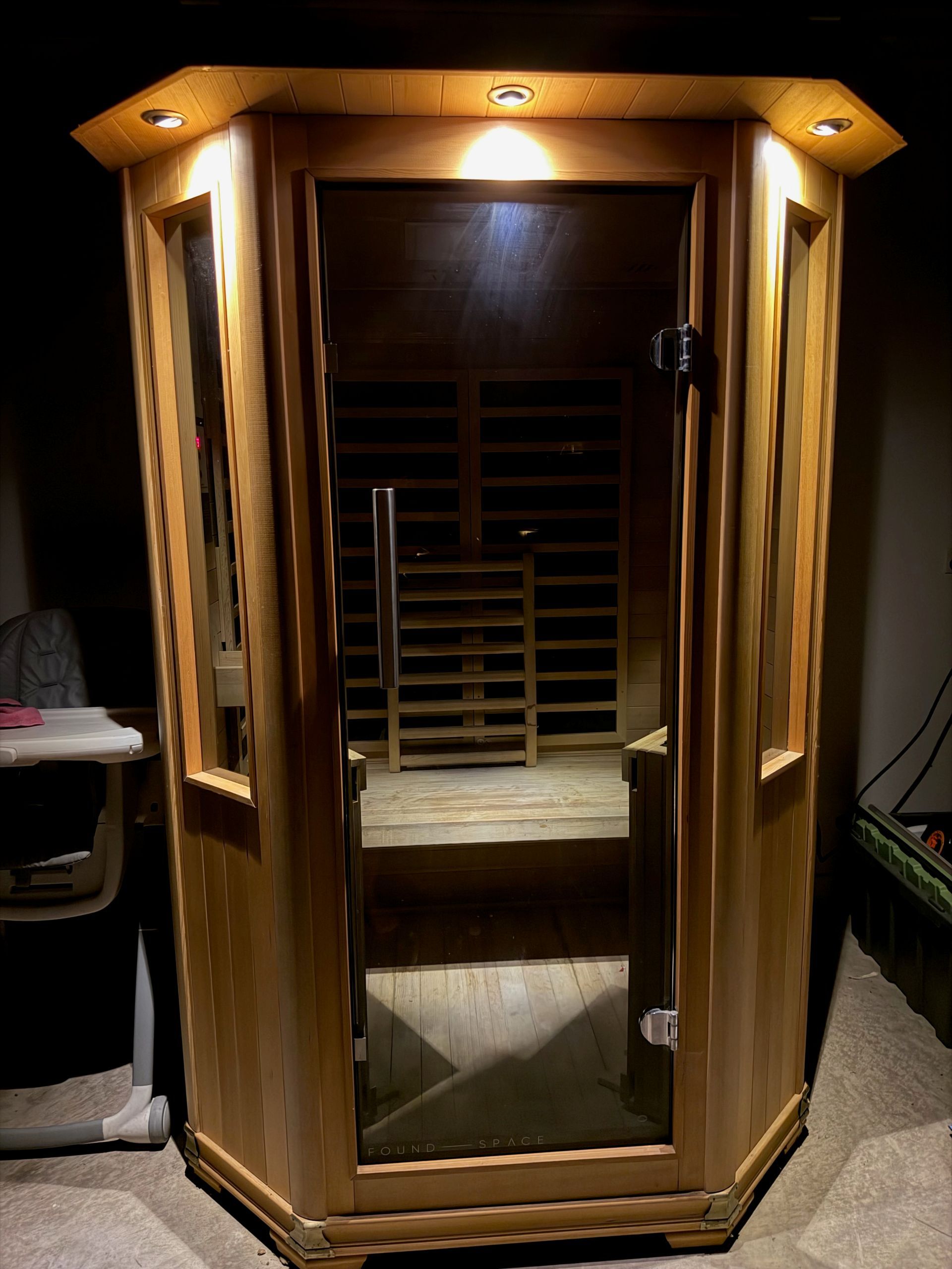 There is a toilet in the hallway downstairs and a living area with a TV and large couch.