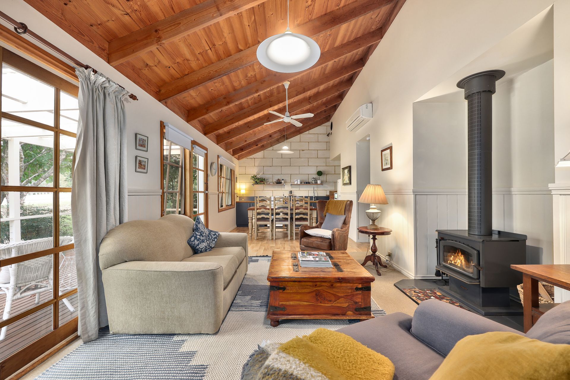 The cottage has a well-equipped kitchen, open plan lounge and dining room with a wood fireplace and views over established gardens from a deck.