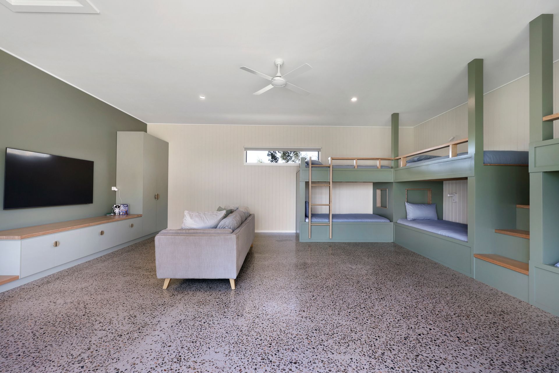At the very end of the house, you will find a massive room where there are 3 king single bunk beds built, a couch and TV.