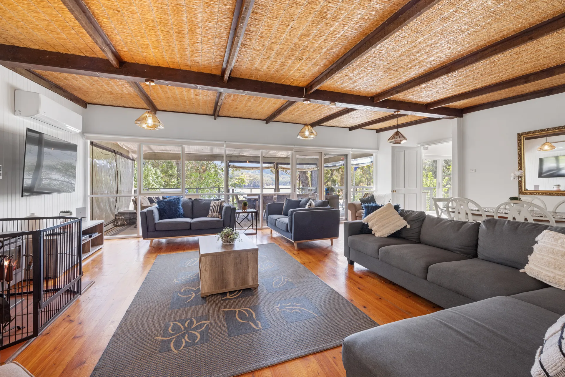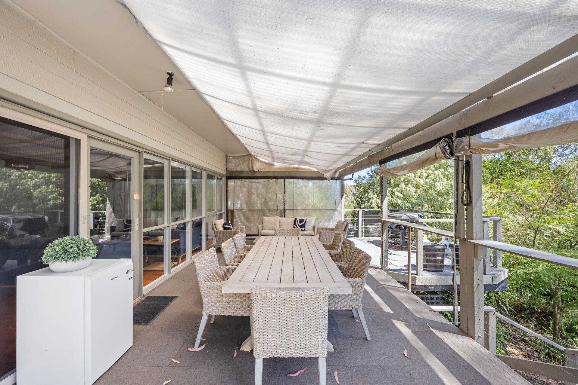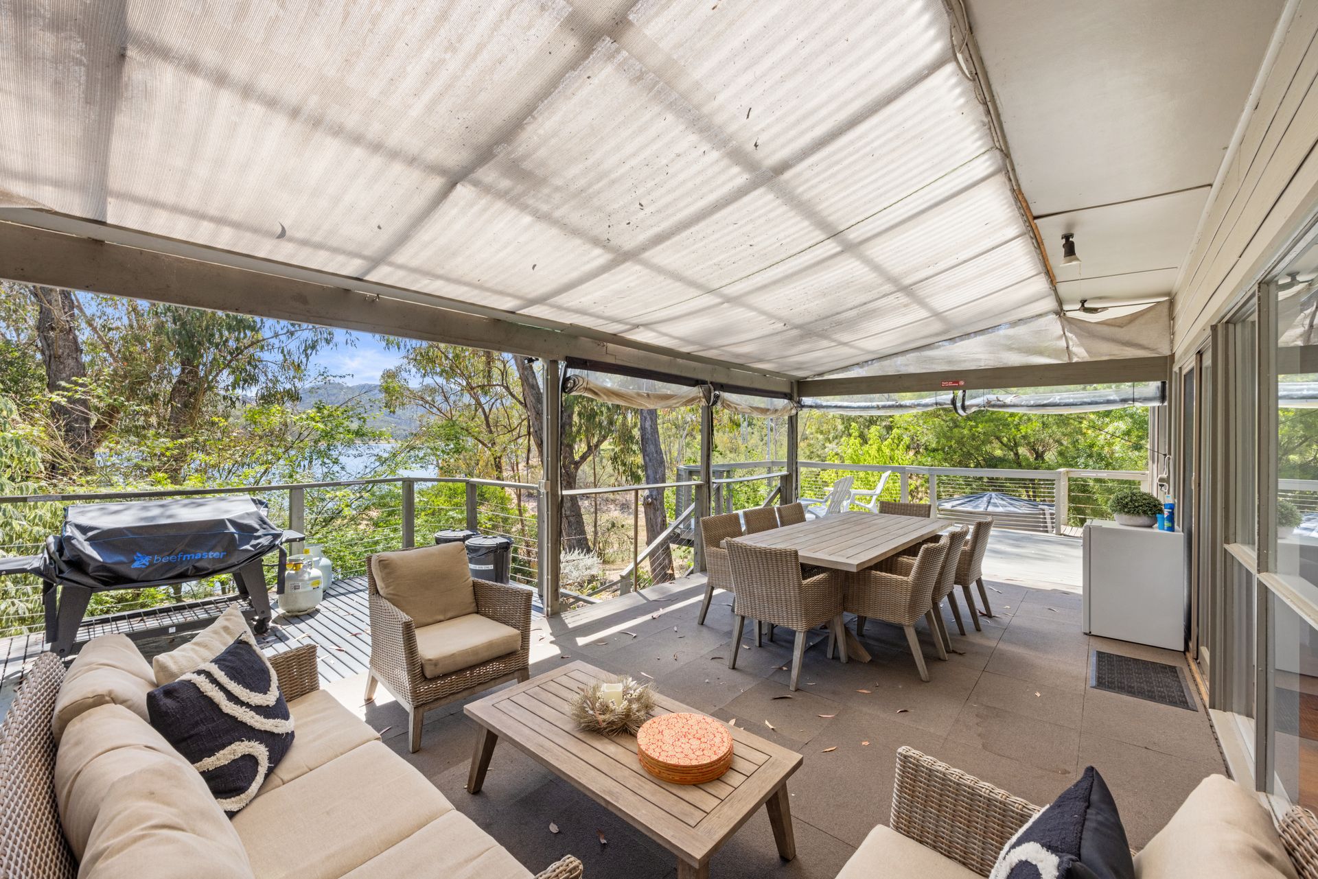 The back deck is for entertaining. It is enclosed with patio blinds. These blinds can be rolled up in summer so you can enjoy the water breezes or lowered on cooler nights so you can enjoy the surroundings. In addition to an 8-seat outdoor dining set and a 5-seat cane lounge to relax after or before your meal, the deck is also equipped with a gas BBQ
