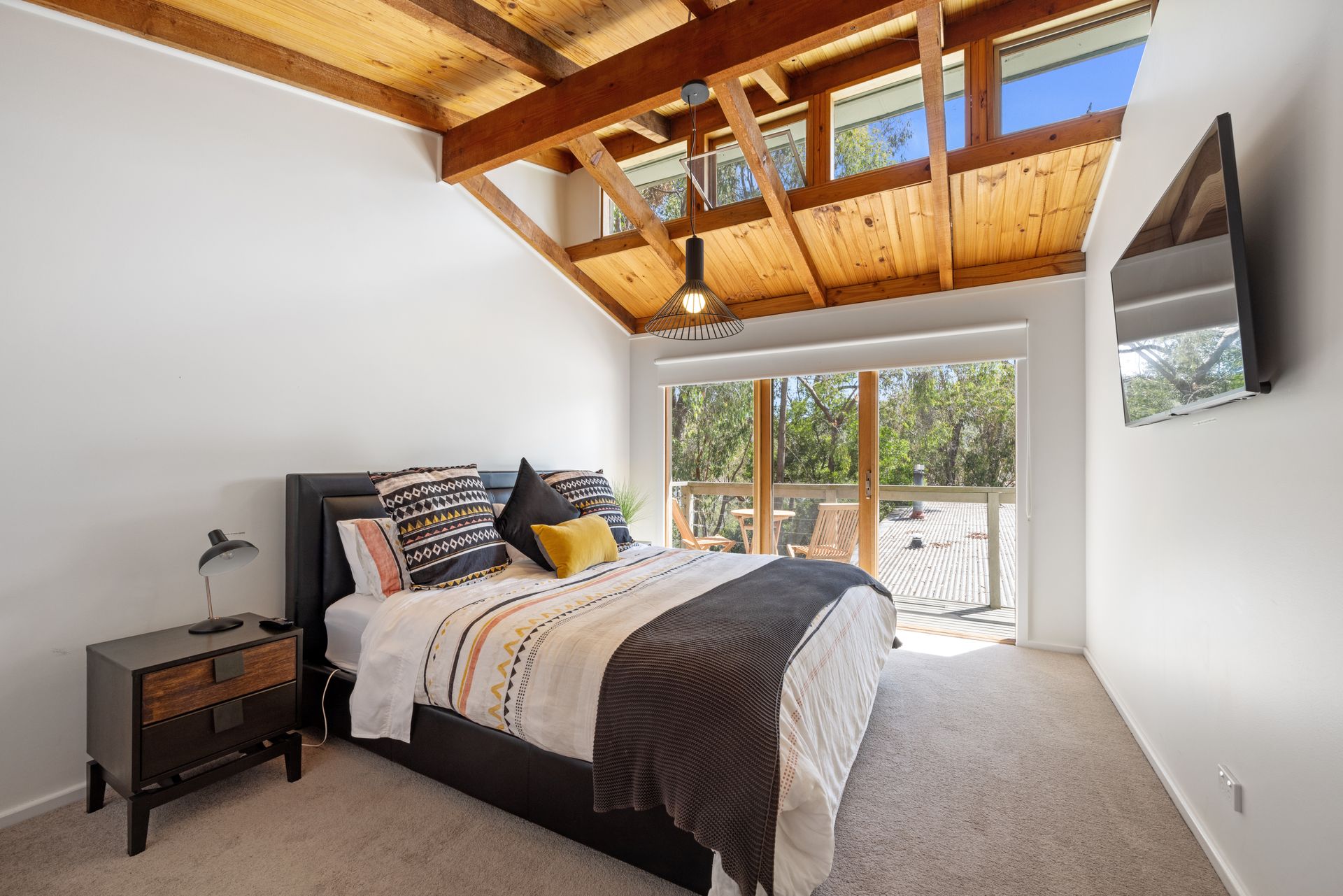 Bedroom 2 is a spacious upstairs retreat offering a beautiful view of the lake. It features a king-sized bed adorned with high-quality linen for the pillows and doonas. This room shares a bathroom with Bedroom 1, which is stocked with fresh towels, shampoo, conditioner, and body wash for your convenience. Additional amenities include a built-in wardrobe with ample space and coat hangers, along with cozy robes and complimentary slippers for added comfort. The room is equipped with a split-system heating and cooling system and a newly installed 55-inch smart TV.