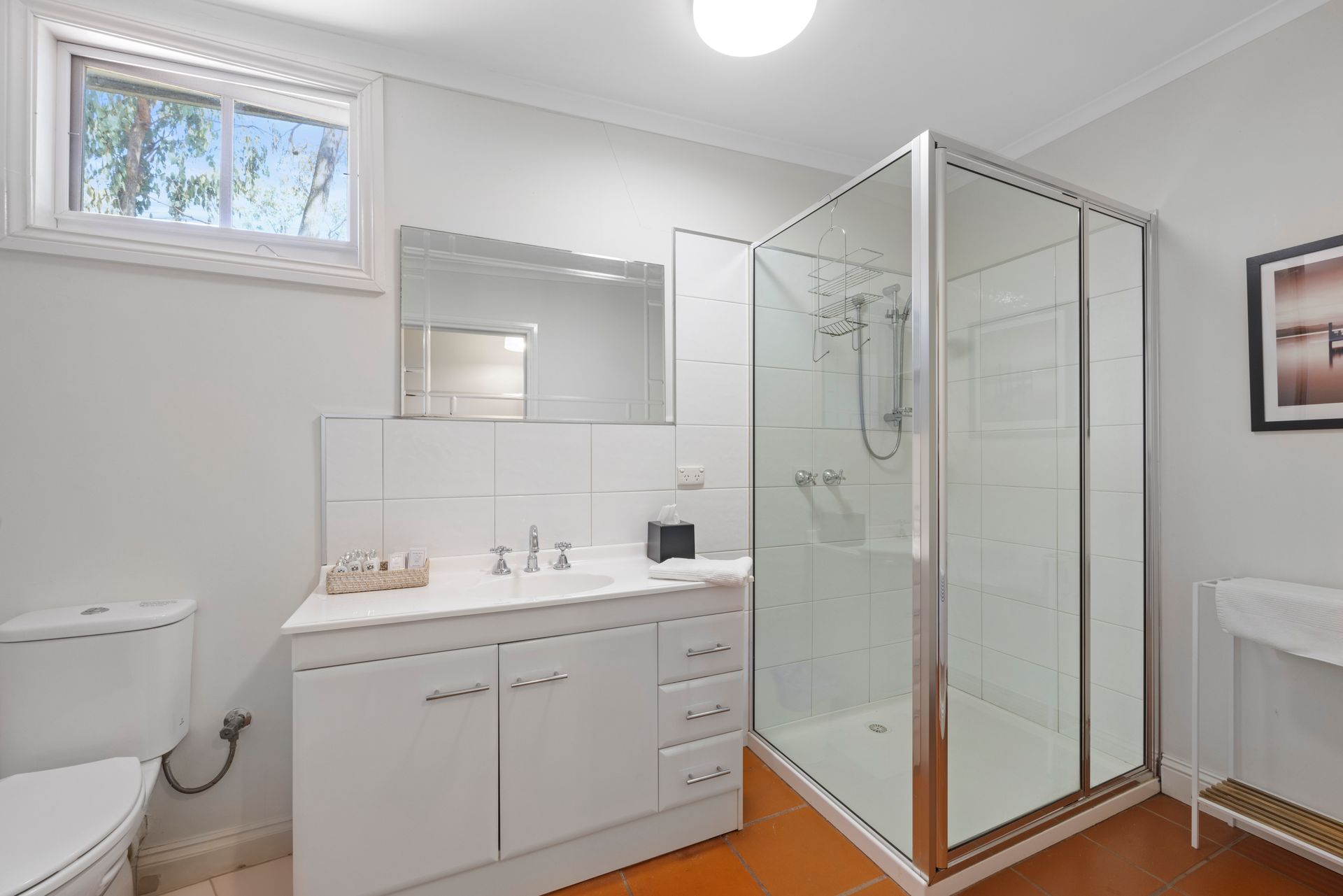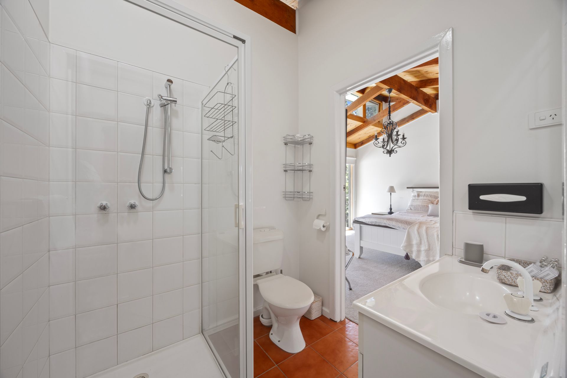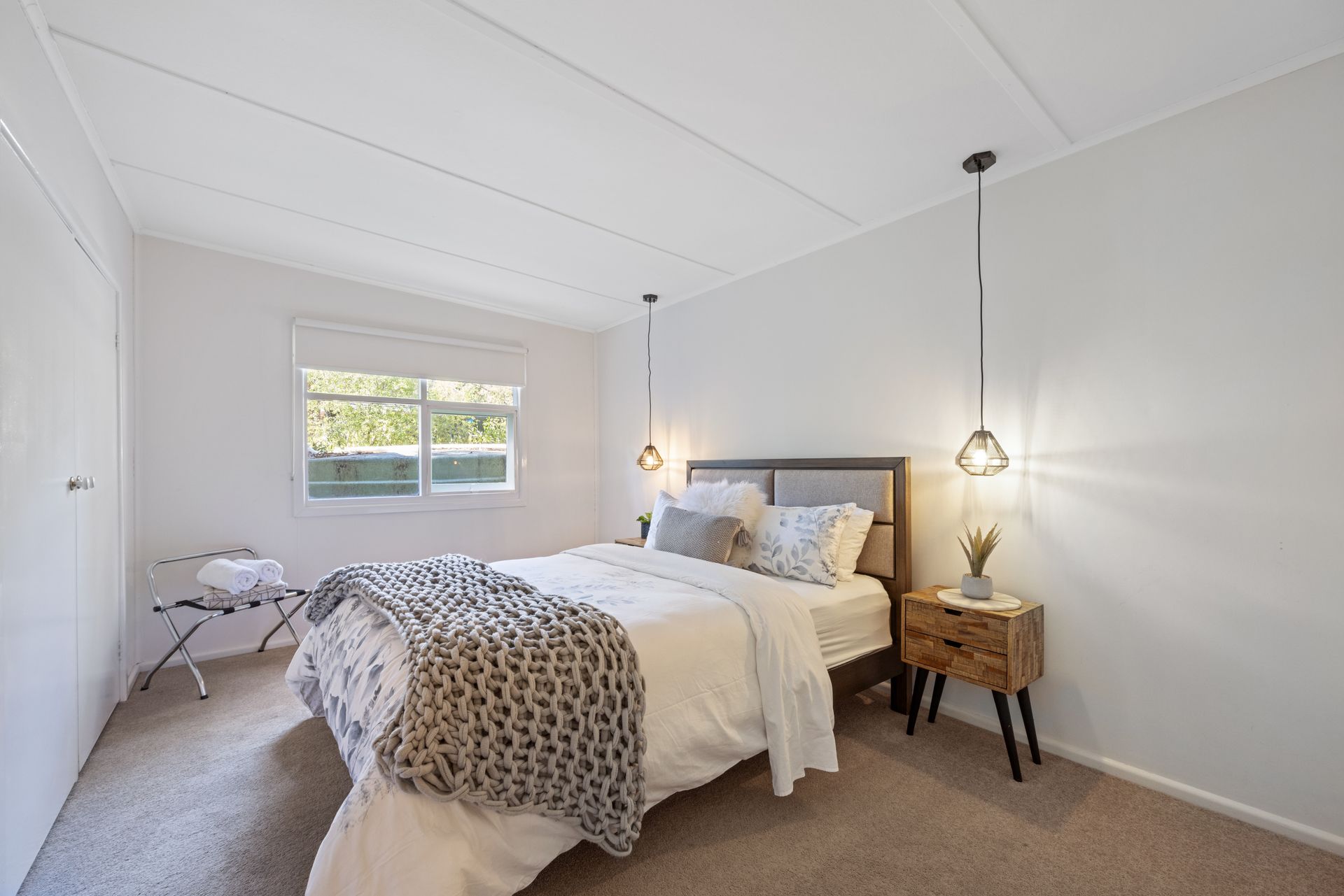 Located downstairs, is Bedroom 3 features a queen bed and a large wardrobe, complemented by high-quality linen that matches the house’s elegant theme. The main bathroom is conveniently located just across the room.