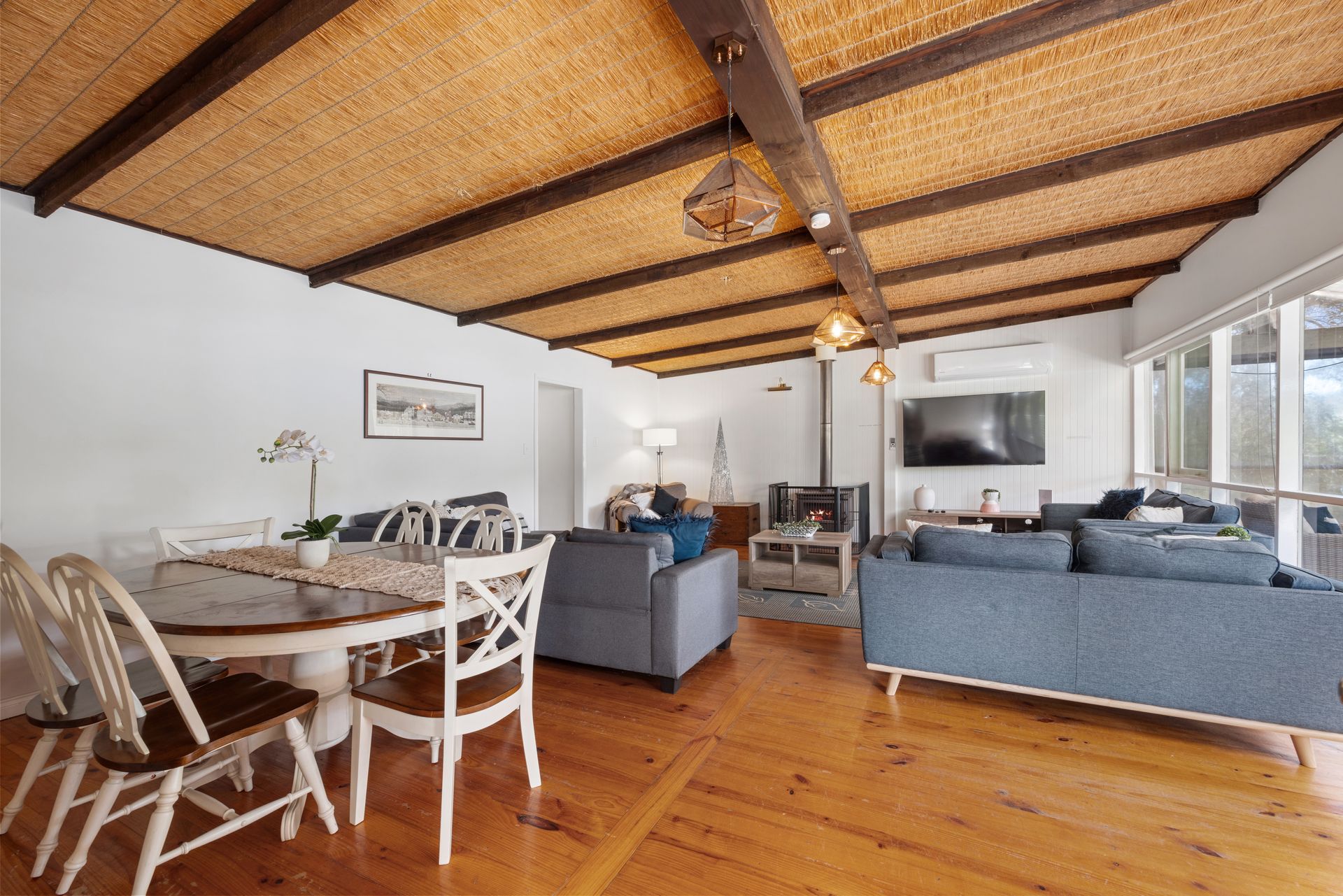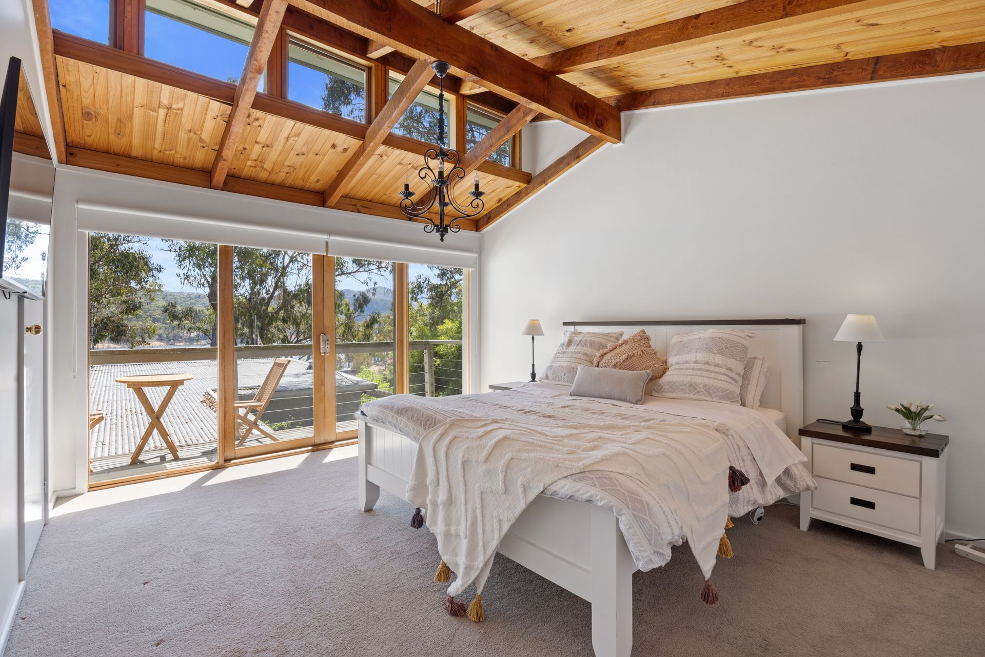 Upstairs, Bedroom 1 invites you to awaken and raise the blinds to a breathtaking view of the lake. This luxurious retreat features a king-sized bed dressed in high-quality Egyptian cotton linen for the ultimate in comfort. The adjoining ensuite is thoughtfully stocked with fresh towels, shampoo, conditioner, and body wash, along with cozy robes and complimentary slippers. A set of drawers provides convenient storage for your belongings. To ensure your stay is as relaxing as possible, the room is equipped with a split-system heating and cooling system and a newly installed 55-inch smart TV, perfect for unwinding after a day of adventure.