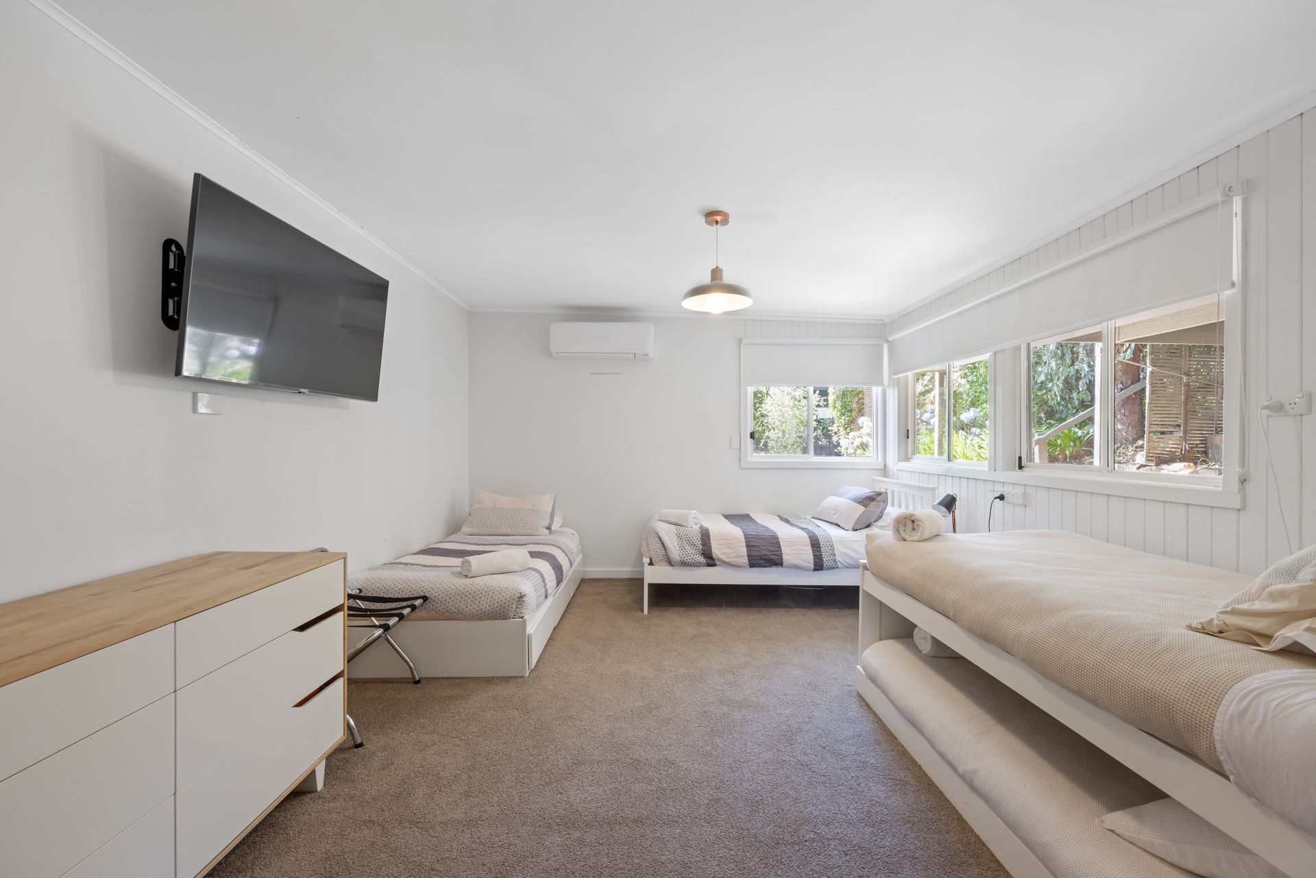 Also located downstairs is the fourth bedroom is designed with two single beds and two pull-out trundle mattresses, making it perfect for families or additional guests. Fresh towels and high-quality cotton sheets are provided—because we believe in offering only the best for a restful night’s sleep. The room also includes a set of drawers for convenient clothing storage. Carpeted for comfort, it features split heating and air conditioning, along with a newly installed 55-inch smart TV for your entertainment.
